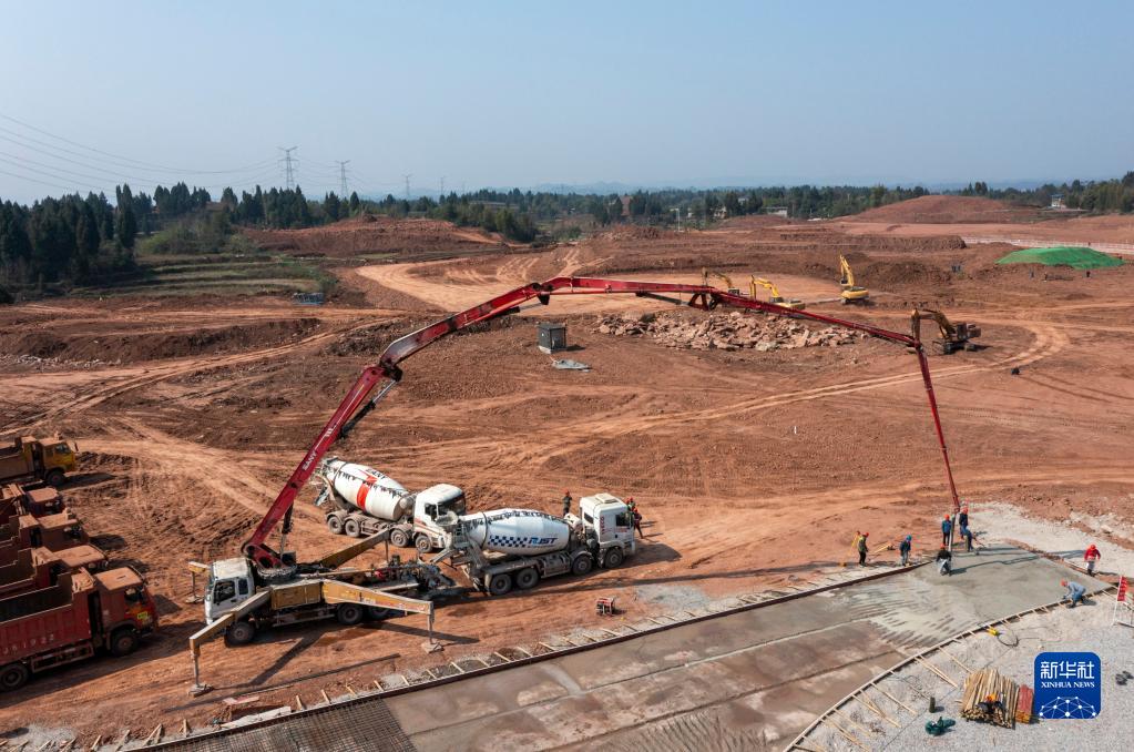 2月26日,在重慶銅梁區少云鎮高碑村川渝1000千伏特高壓交流工程(重慶段)特高壓變電站施工現場(chǎng),工人們依靠大型機械設備進(jìn)行施工作業(yè)(無(wú)人機照片)。