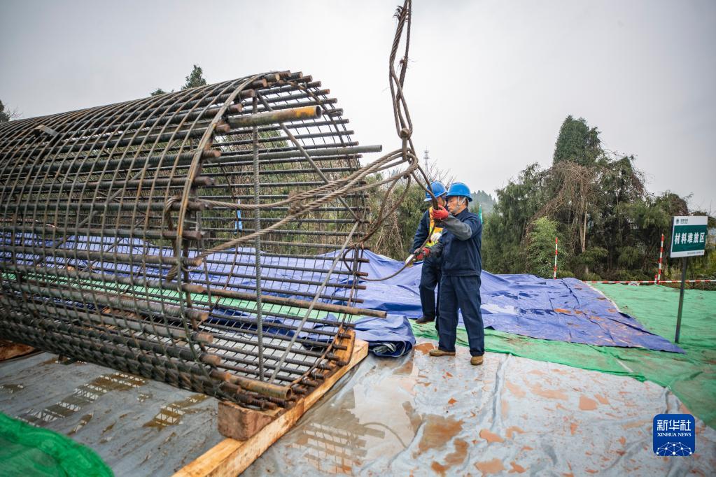 3月1日,在重慶市潼南區小渡鎮川渝1000千伏特高壓交流工程(重慶段)施工現場(chǎng),工作人員在捆綁即將起吊的鋼筋籠。