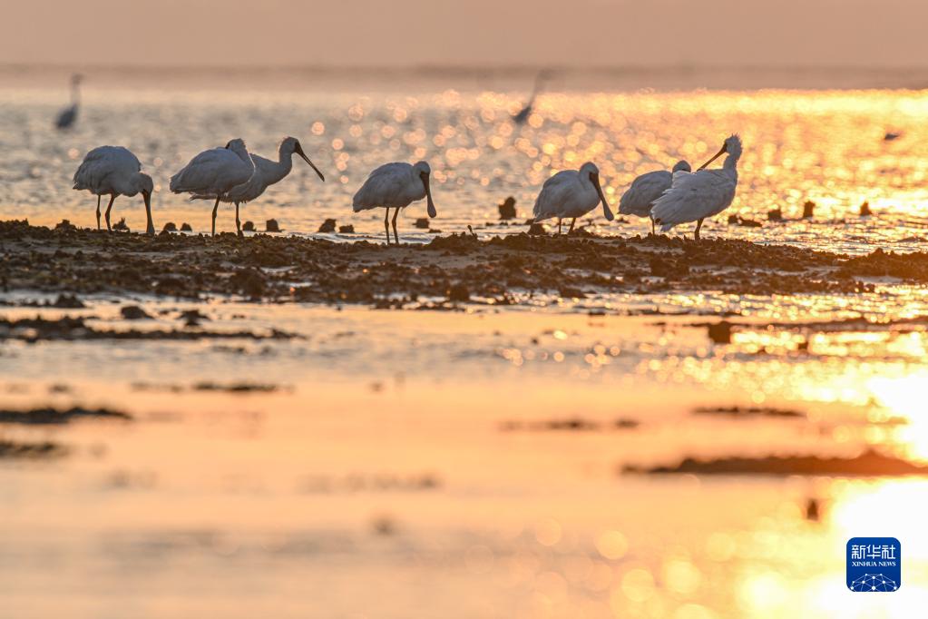 一群黑臉琵鷺在環(huán)新英灣地區一處濕地休憩(2022年12月13日攝)。