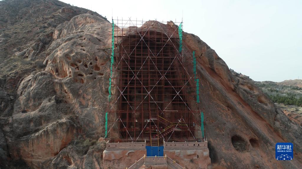 這是寧夏須彌山石窟正在修復中的大佛(2月28日攝,無(wú)人機照片)。