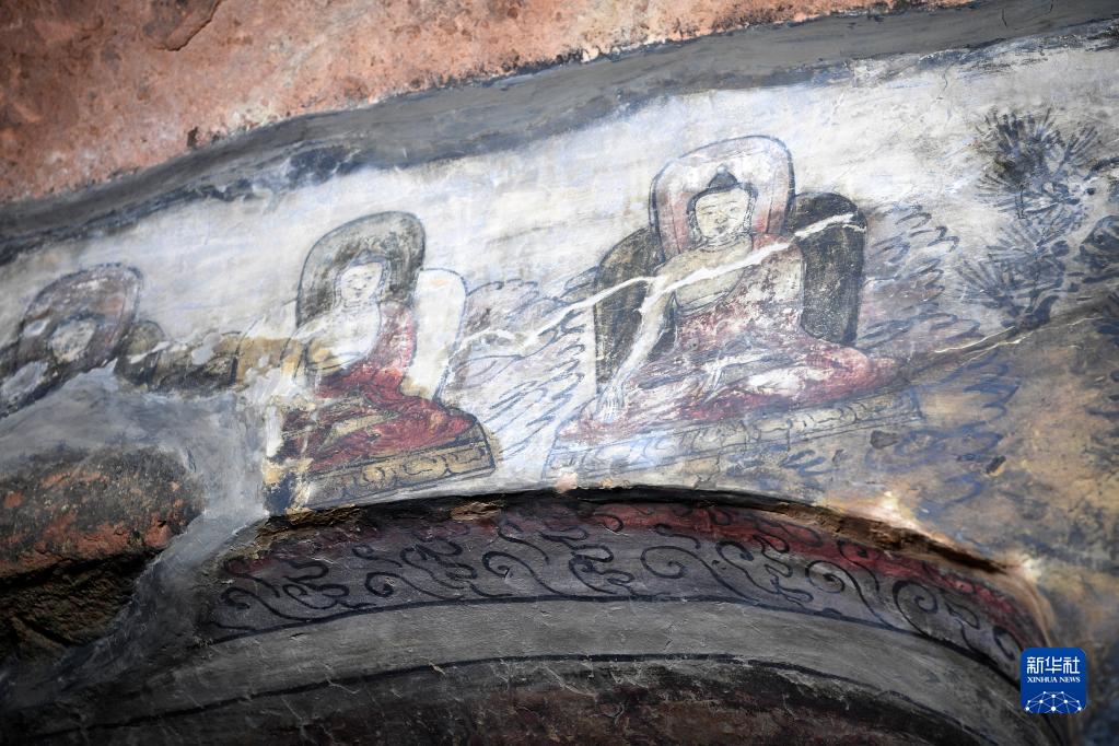 這是寧夏須彌山石窟圓光寺48號窟內完成修復的壁畫(huà)(2月28日攝)。