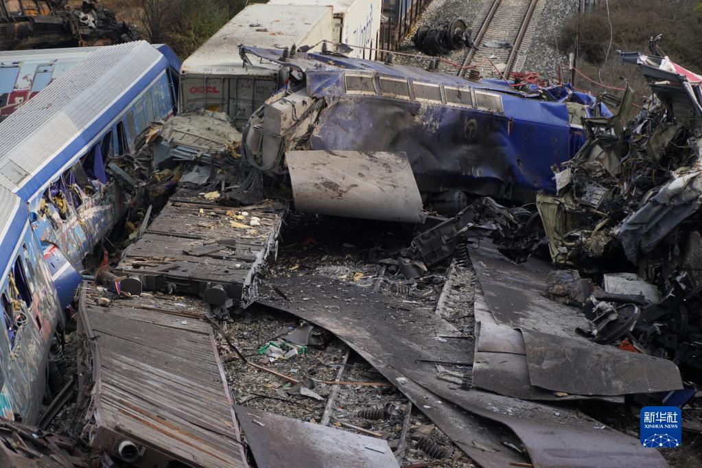這是3月1日在希臘中部城市拉里薩市附近拍攝的火車(chē)相撞事故現場(chǎng)。