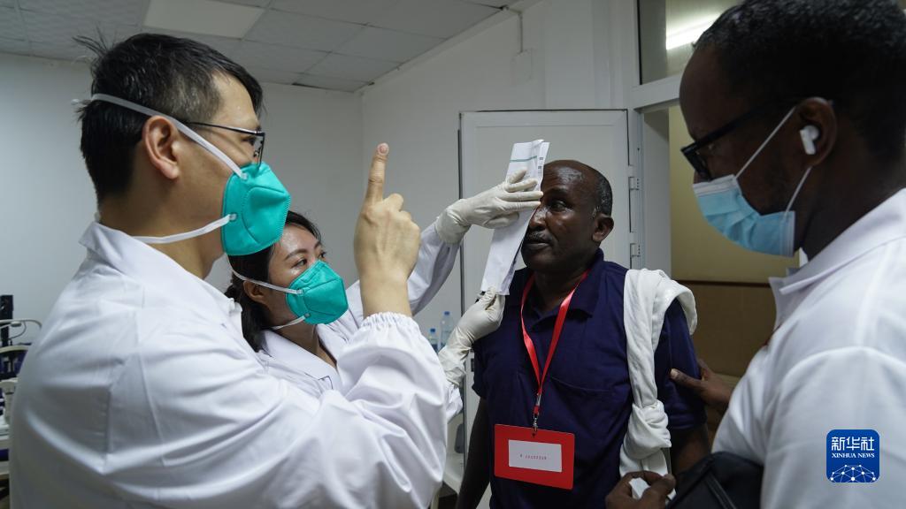 2月26日,在吉布提首都吉布提市貝爾蒂醫院,醫療隊隊員為一名白內障致盲患者進(jìn)行視力檢查。