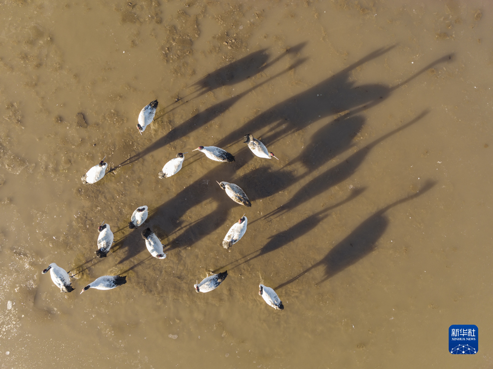 這是在拉薩市林周縣卡孜水庫拍攝的黑頸鶴(3月1日攝,無(wú)人機照片)。