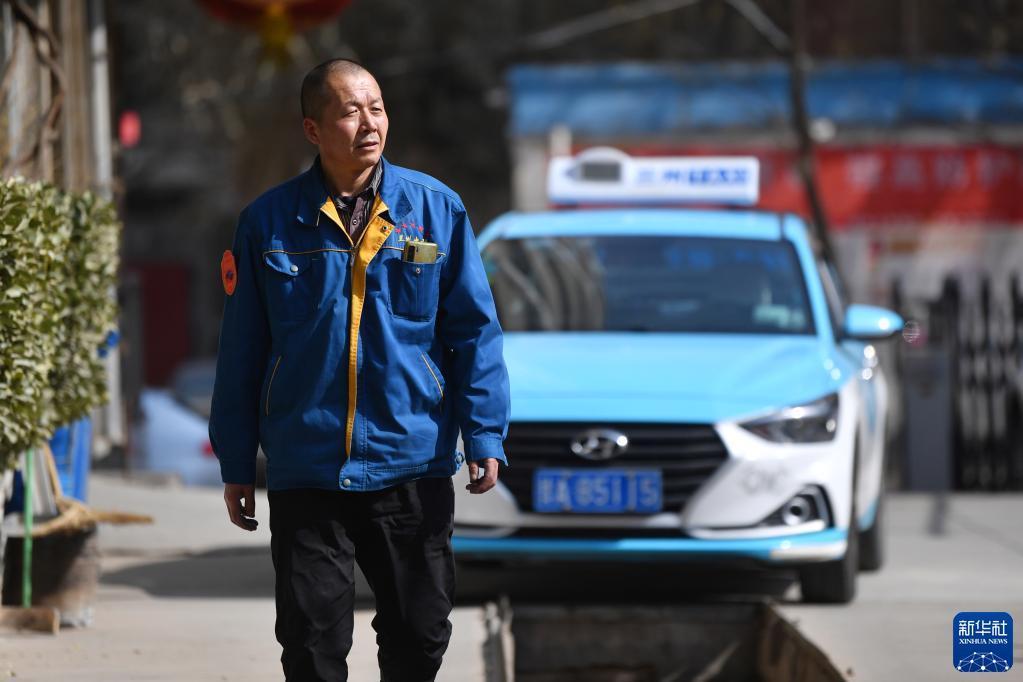 強漢紅從自己駕駛的出租車(chē)前走過(guò)(3月1日攝)。