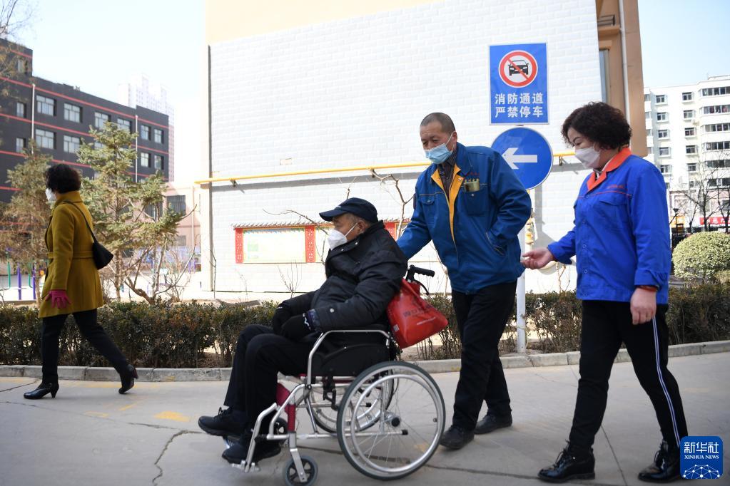 強漢紅(右二)和同事胡建萍(右一)一起接送一位行動(dòng)不便的老人去醫院就醫(3月1日攝)。