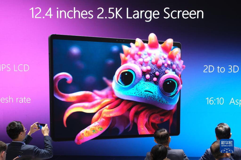 2月28日,在西班牙巴塞羅那,人們在世界移動(dòng)通信大會(huì )上觀(guān)看中興裸眼3D平板電腦發(fā)布會(huì )。