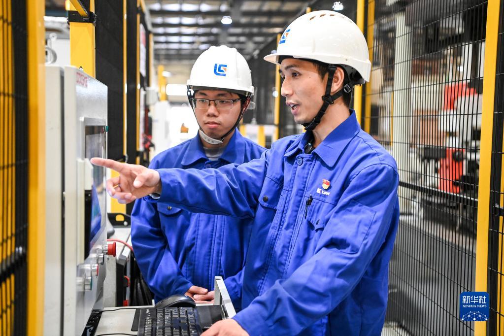 2月14日,在廣西柳工機械股份有限公司的生產(chǎn)車(chē)間內,周穎峰(右)給徒弟講解數控設備操作細節。