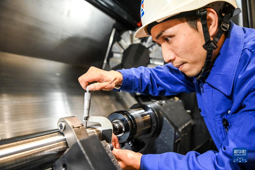 2月14日,在廣西柳工機械股份有限公司的生產(chǎn)車(chē)間內,周穎峰對加工中的液壓配件進(jìn)行測量。