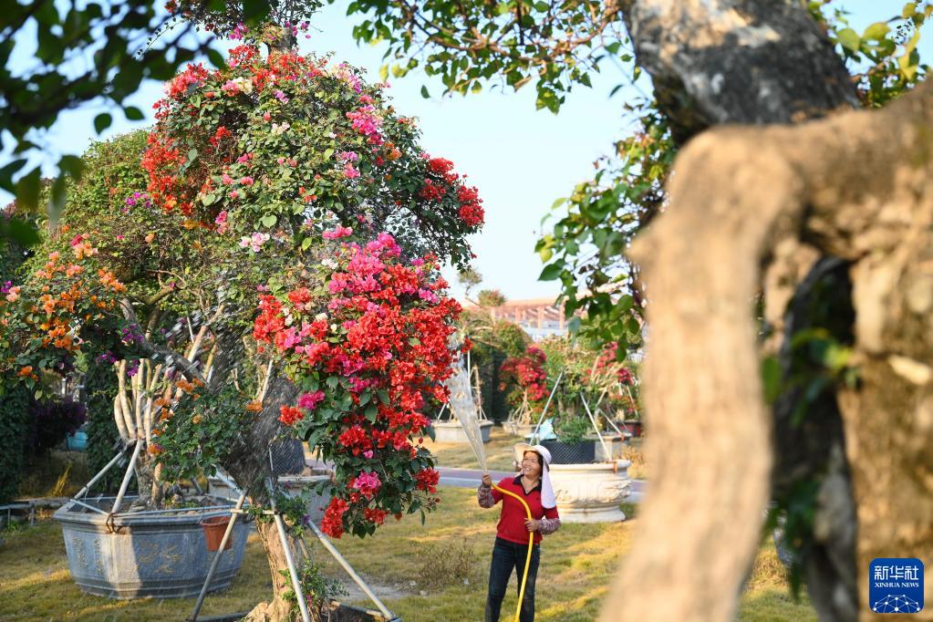 2月28日,在位于漳州高新區的福建坤泰三角梅有限公司,工作人員在給三角梅澆水。