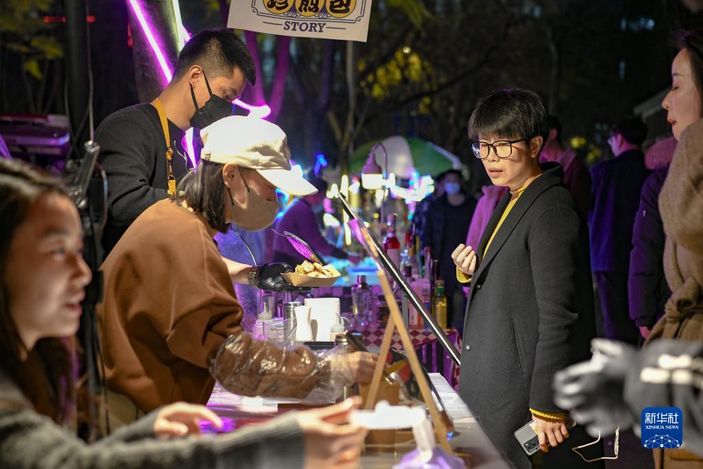 在四川省成都市錦江區三色路夜市,市民在購買(mǎi)小吃(2月28日攝)。