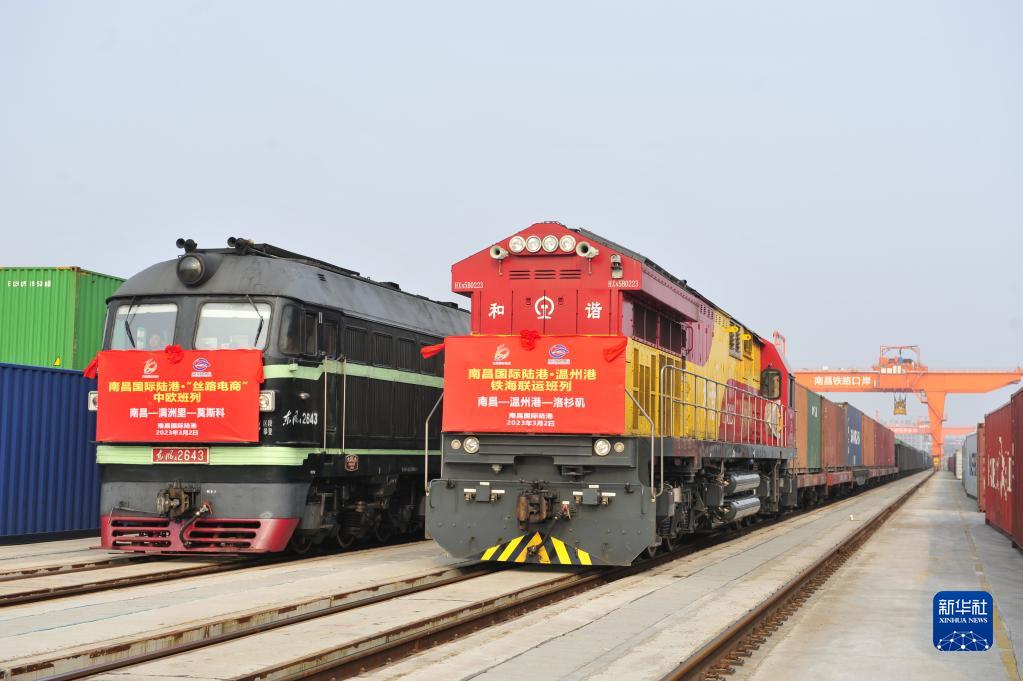 3月2日,“南昌-滿(mǎn)洲里-莫斯科”中歐班列(左)、“南昌-溫州港-洛杉磯”鐵海聯(lián)運班列準備從南昌國際陸港鐵路口岸二期駛出。
