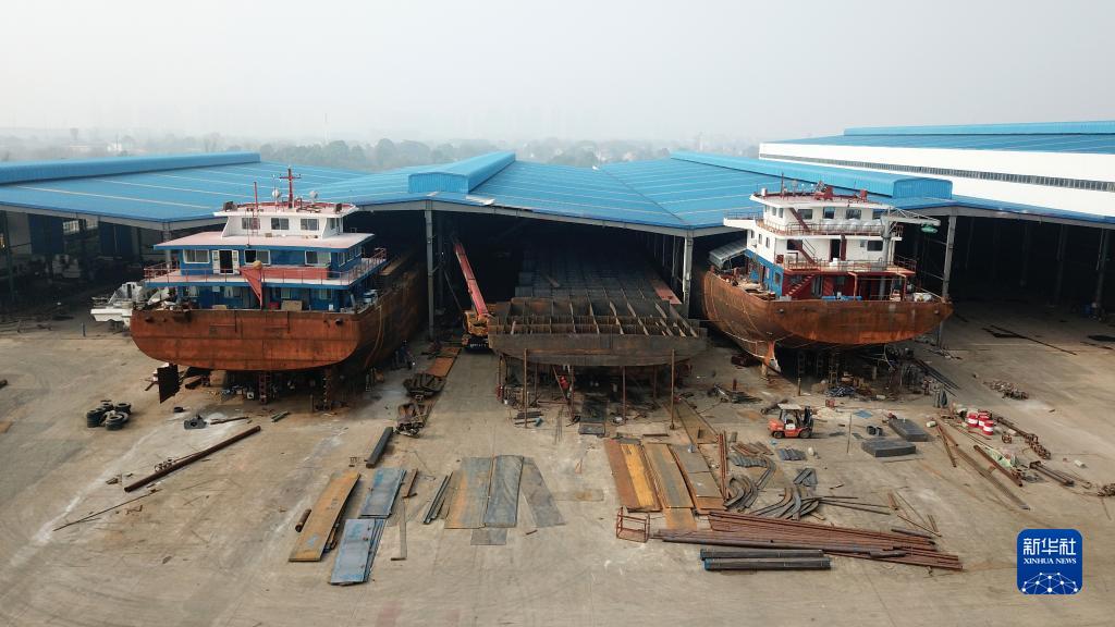 這是3月2日在沅江市湖南桃花江游艇制造有限公司拍攝的貨運船(無(wú)人機照片)。