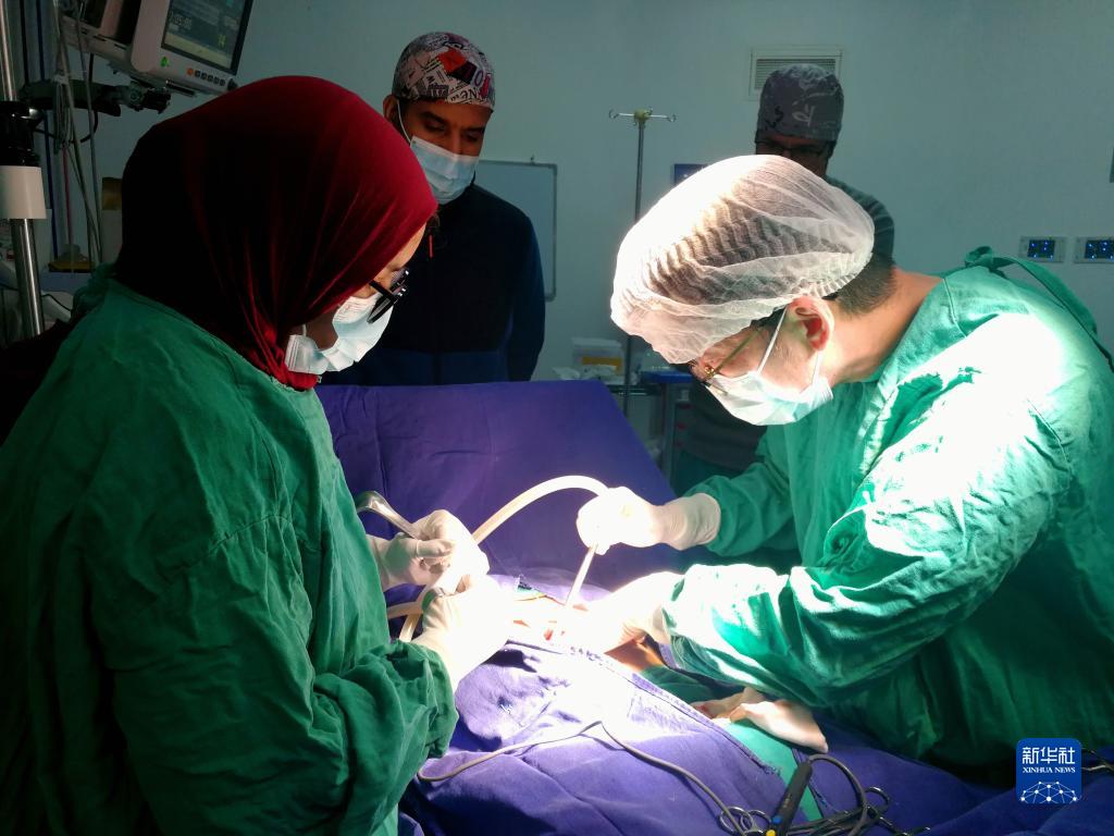 2月3日,在摩洛哥拉希迪耶,中國援摩醫療隊的普外科醫生陳吉(右一)為一名患者做十二指腸潰瘍急性穿孔修補手術(shù)。