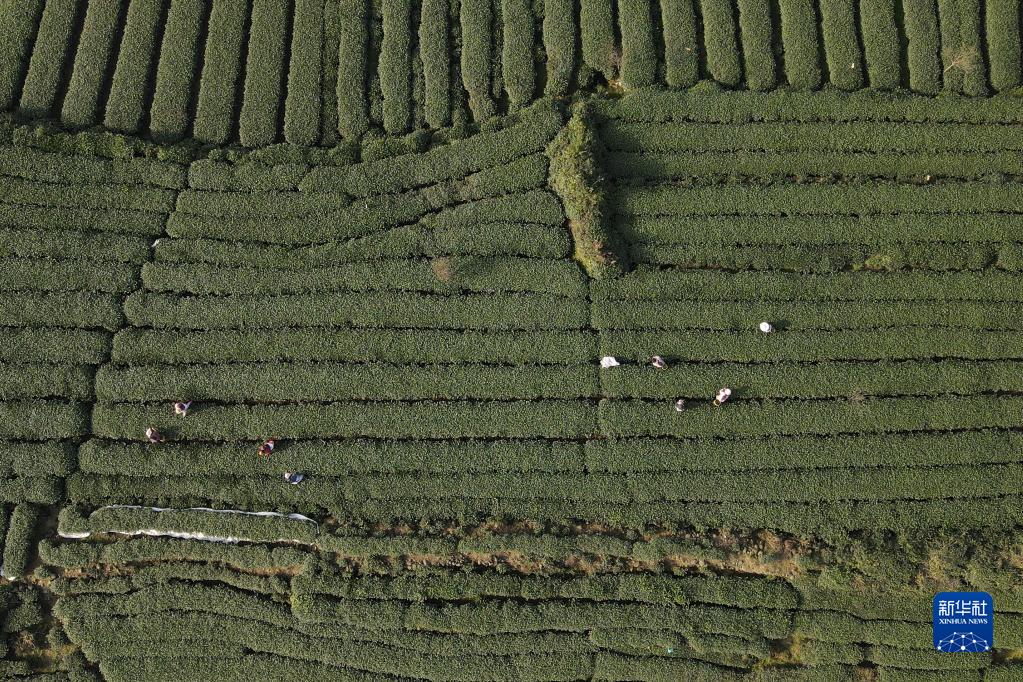 3月1日,在雅安市名山區騎龍場(chǎng)萬(wàn)畝觀(guān)光生態(tài)茶園內,茶農在采摘春茶(無(wú)人機照片)。