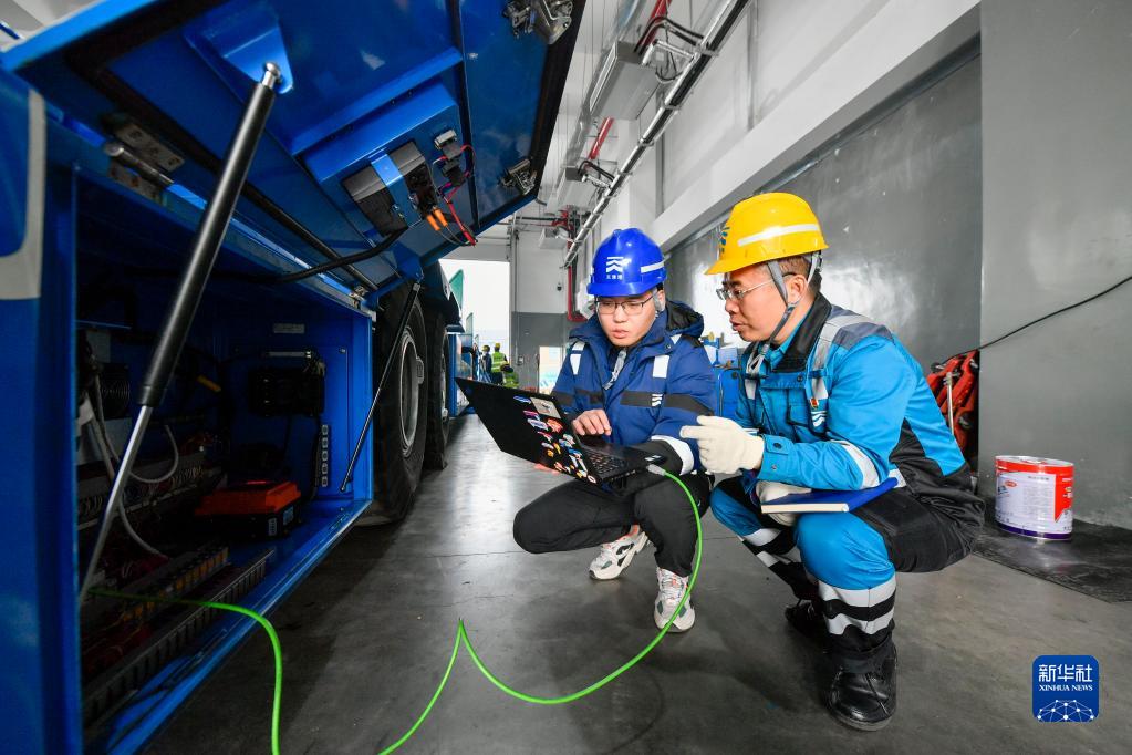 在天津港全物聯(lián)網(wǎng)集裝箱碼頭維修間,成衛東(右)與技術(shù)工程師對智能水平運輸機器人進(jìn)行程序編輯(2月17日攝)。