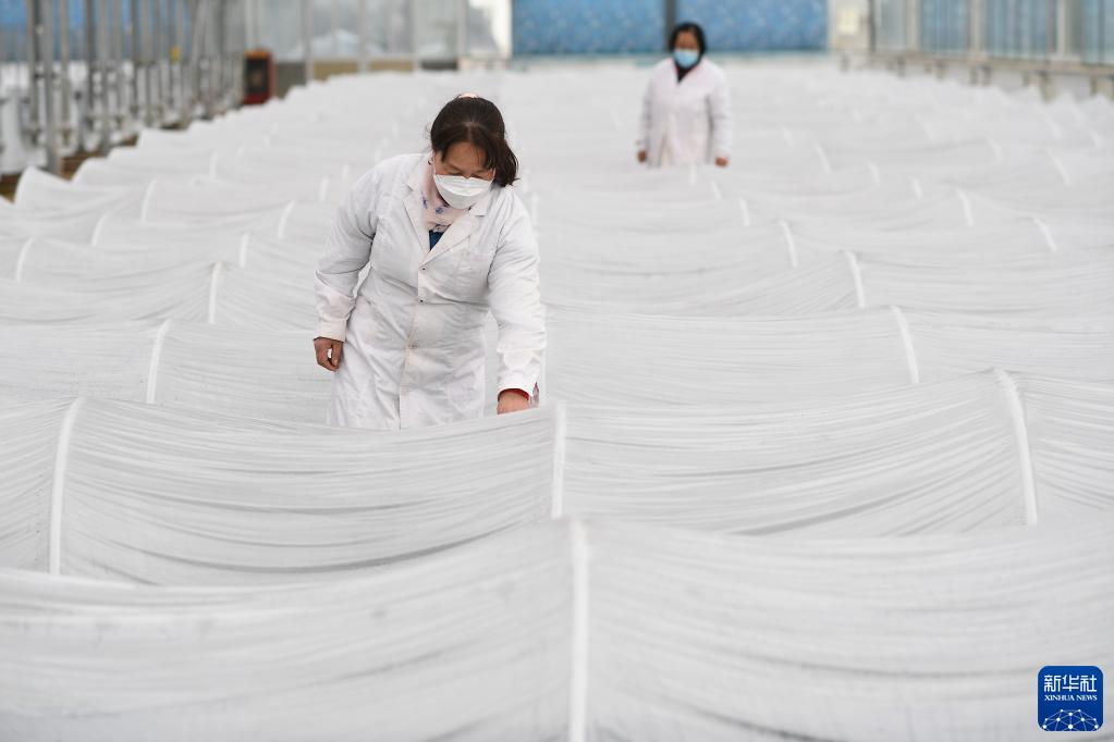 工作人員在寧夏西吉縣恒豐馬鈴薯種薯脫毒繁育中心查看種薯繁育情況(3月2日攝)。