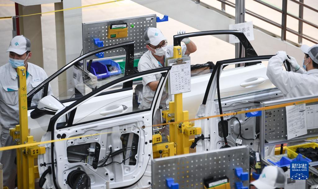 在廣州市番禺區的廣汽埃安新能源汽車(chē)股份有限公司總裝車(chē)間,工人在安裝車(chē)門(mén)密封膠條(2月24日攝)。