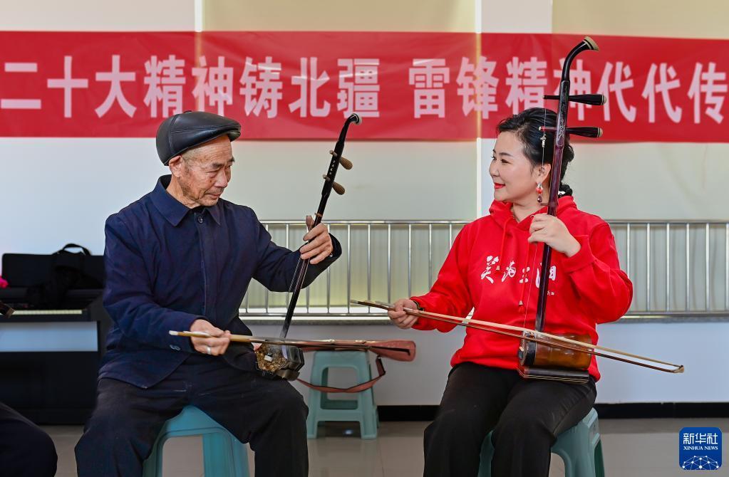 3月3日,在二連浩特市格日勒敖都蘇木賽烏素嘎查文化室,文藝志愿者蔡霞(右)為二胡音樂(lè )愛(ài)好者傳授演奏技藝。