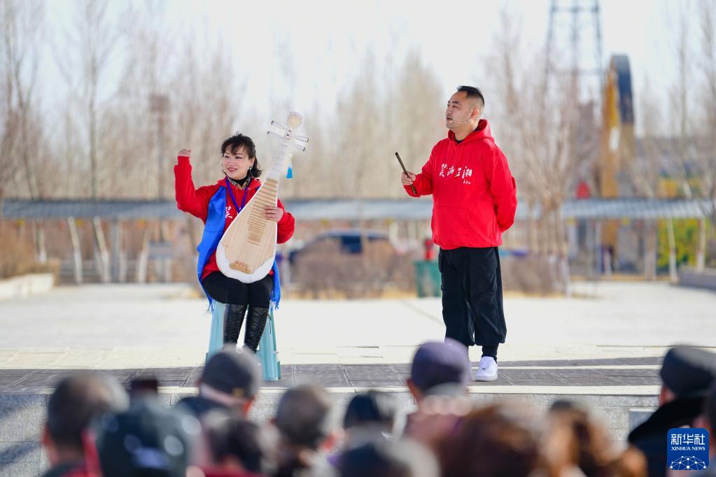 3月3日,在二連浩特市格日勒敖都蘇木賽烏素嘎查文化廣場(chǎng),文藝志愿者為群眾表演節目。