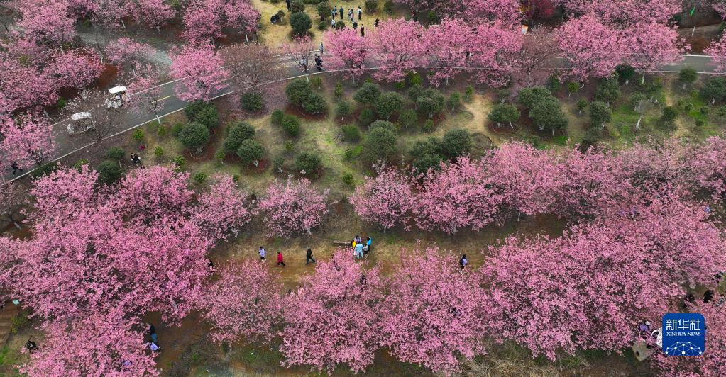 3月4日,游人在常寧市羅橋鎮櫻花園內觀(guān)賞櫻花(無(wú)人機照片)。