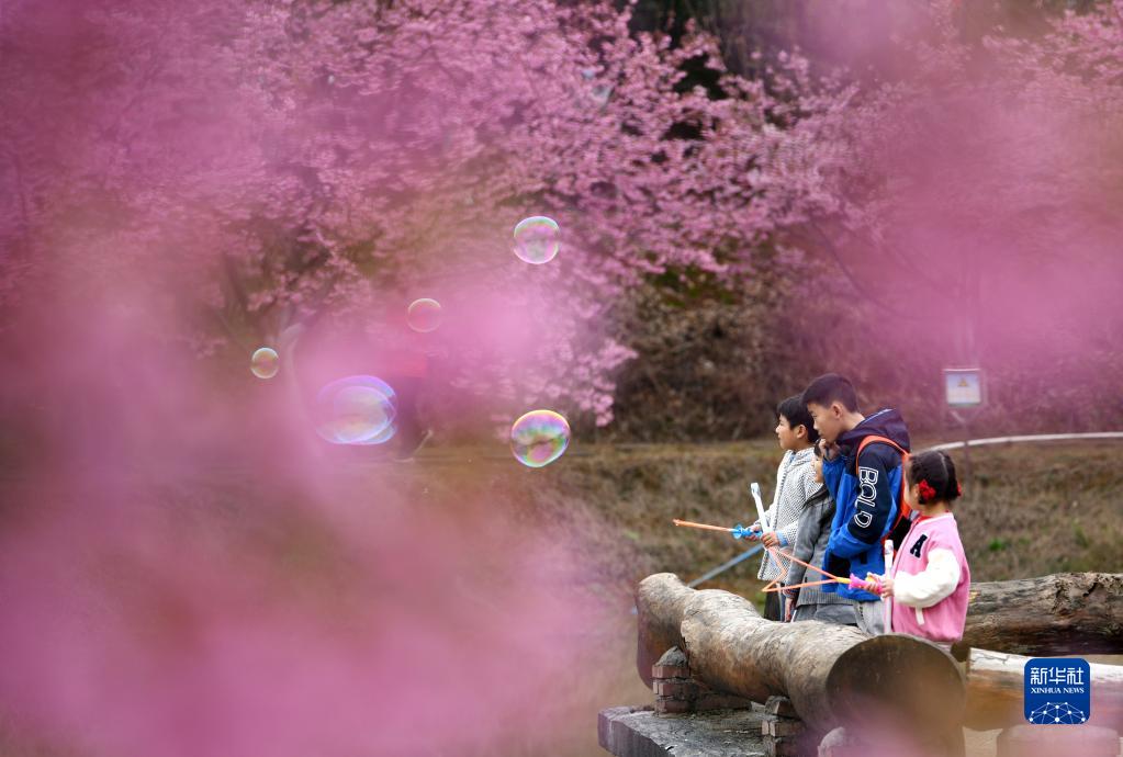 3月4日,小朋友在常寧市羅橋鎮櫻花園內玩耍。