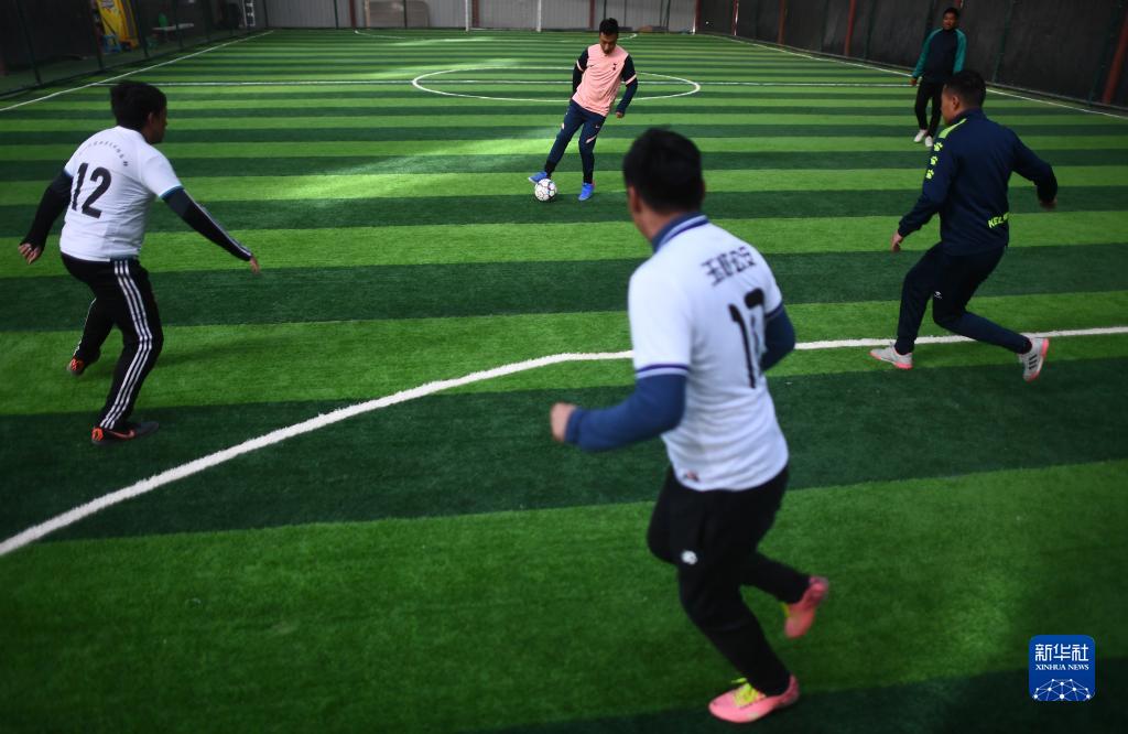 3月2日,在玉樹(shù)州玉樹(shù)市一處室內球場(chǎng),幾名足球愛(ài)好者正在踢球。
