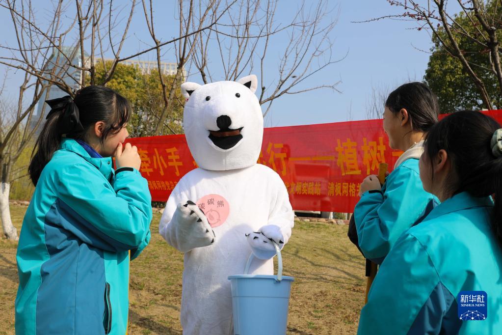3月5日,穿著(zhù)卡通服裝的志愿者給參加義務(wù)植樹(shù)活動(dòng)的學(xué)生們講解植樹(shù)知識。