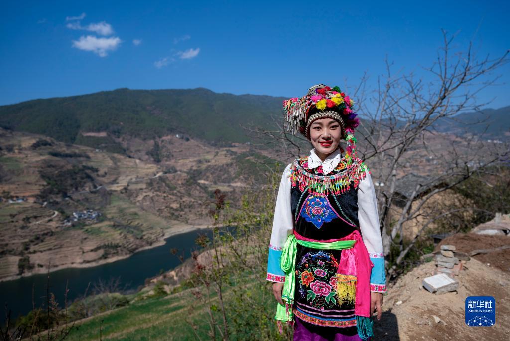 魯麗華身著(zhù)民族服飾站在南澗縣樂(lè )秋鄉的山野里(2月6日攝)。