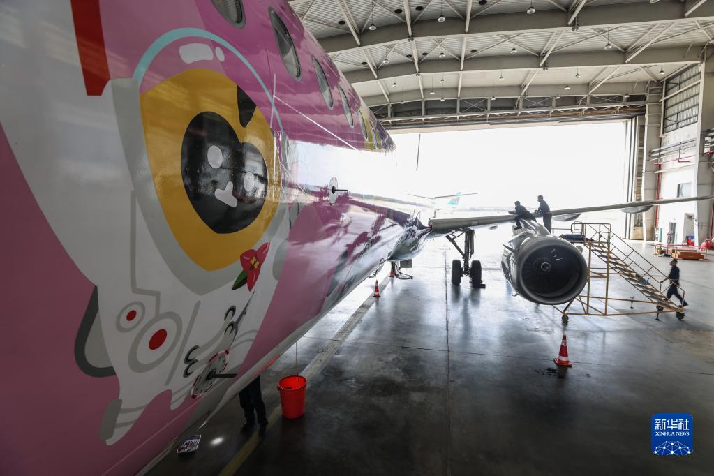 3月7日,在??诿捞m國際機場(chǎng),南航機務(wù)人員對“消博號”彩繪飛機進(jìn)行深度檢查。