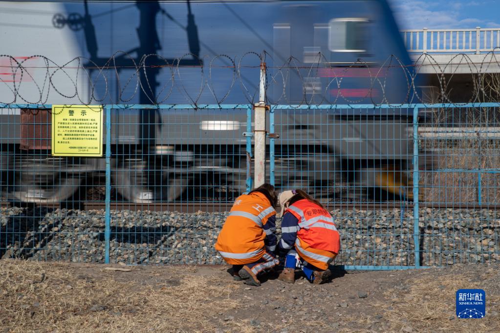 3月6日,在濱洲線(xiàn)199公里處,女子檢驗班班長(cháng)曹蕊(左)和張丹進(jìn)行作業(yè)。