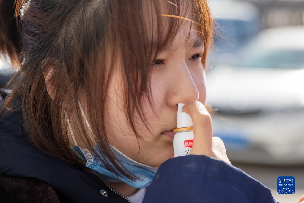 3月6日,在中國鐵路哈爾濱局集團有限公司大慶工務(wù)段杜爾伯特線(xiàn)路車(chē)間,女子檢驗班的苑鵬鵬在出發(fā)前用藥減輕身體不適。