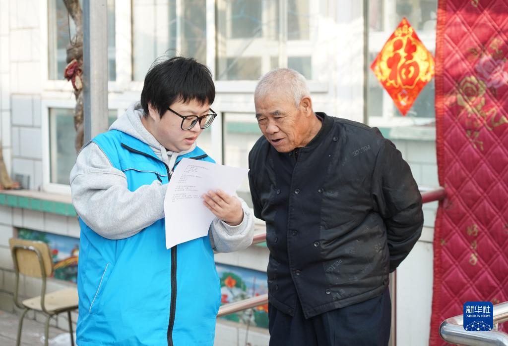 2月22日,在北京市峪口鎮西樊各莊村,王巖峰與獨居老人一起填寫(xiě)老年驛站問(wèn)卷。