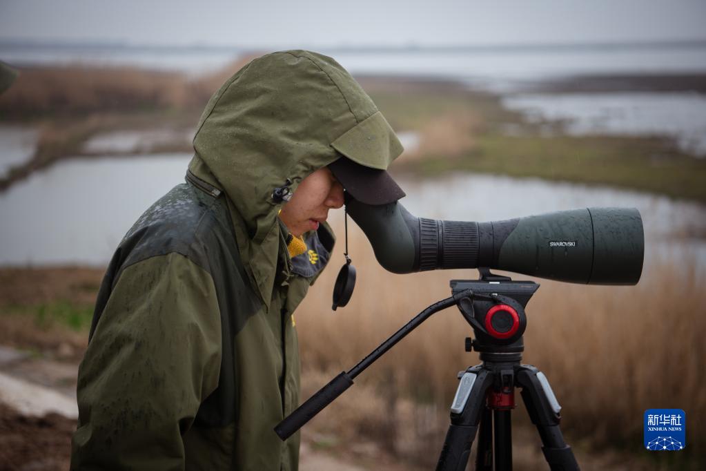 譚文卓使用單筒望遠鏡觀(guān)測鳥(niǎo)類(lèi)(2月16日攝)。