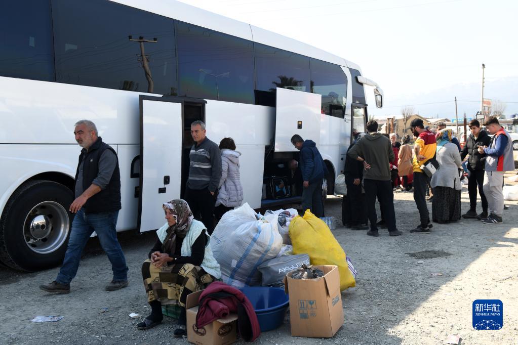 3月7日,房屋被地震摧毀的人們在土耳其哈塔伊等待前往其他城市的公共汽車(chē)。