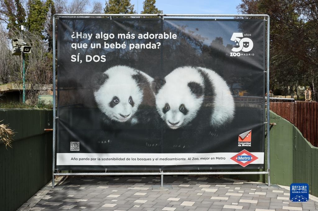 這是3月7日在西班牙馬德里動(dòng)物園拍攝的大熊貓雙胞胎海報,上面寫(xiě)著(zhù)“有什么比一只大熊貓寶寶更可愛(ài)的嗎?有,兩只?!?/p>