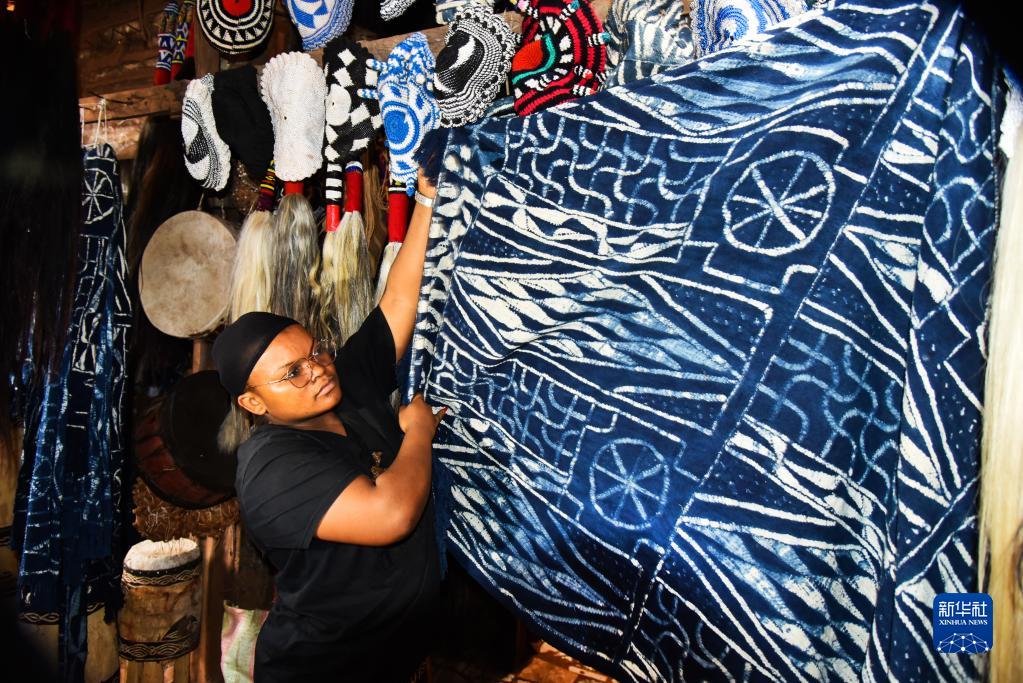 恩多普是主要流行于喀麥隆西部大區的一種布料,可以制成衣物、帽子和項鏈等。制作過(guò)程中,先用墨線(xiàn)在白色棉布上繪制紋樣,再用干燥的棕櫚葉脈做線(xiàn)把紋樣扎起來(lái),經(jīng)靛藍的植物染料浸染后,拆去棕櫚葉脈,便得到藍底白紋的恩多普。如今,眾多喀麥隆婦女投入恩多普制作領(lǐng)域,這不僅改善了她們的生活,也推動(dòng)了文化的傳承。