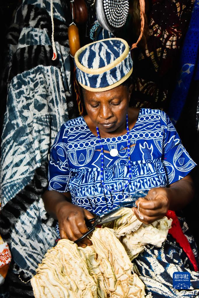 恩多普是主要流行于喀麥隆西部大區的一種布料,可以制成衣物、帽子和項鏈等。制作過(guò)程中,先用墨線(xiàn)在白色棉布上繪制紋樣,再用干燥的棕櫚葉脈做線(xiàn)把紋樣扎起來(lái),經(jīng)靛藍的植物染料浸染后,拆去棕櫚葉脈,便得到藍底白紋的恩多普。如今,眾多喀麥隆婦女投入恩多普制作領(lǐng)域,這不僅改善了她們的生活,也推動(dòng)了文化的傳承。