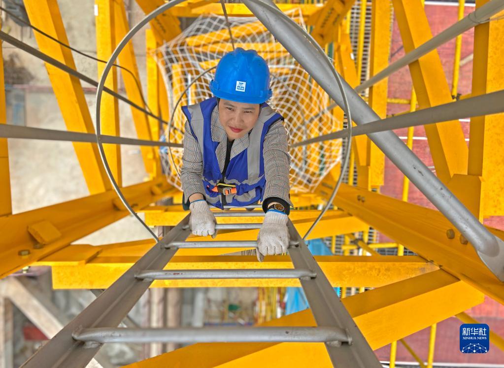 3月7日,在廣西南寧市良慶區五象大道中建三局一公司南寧中銀金融中心項目建設工地,覃桂英爬梯子,準備進(jìn)入工作崗位。