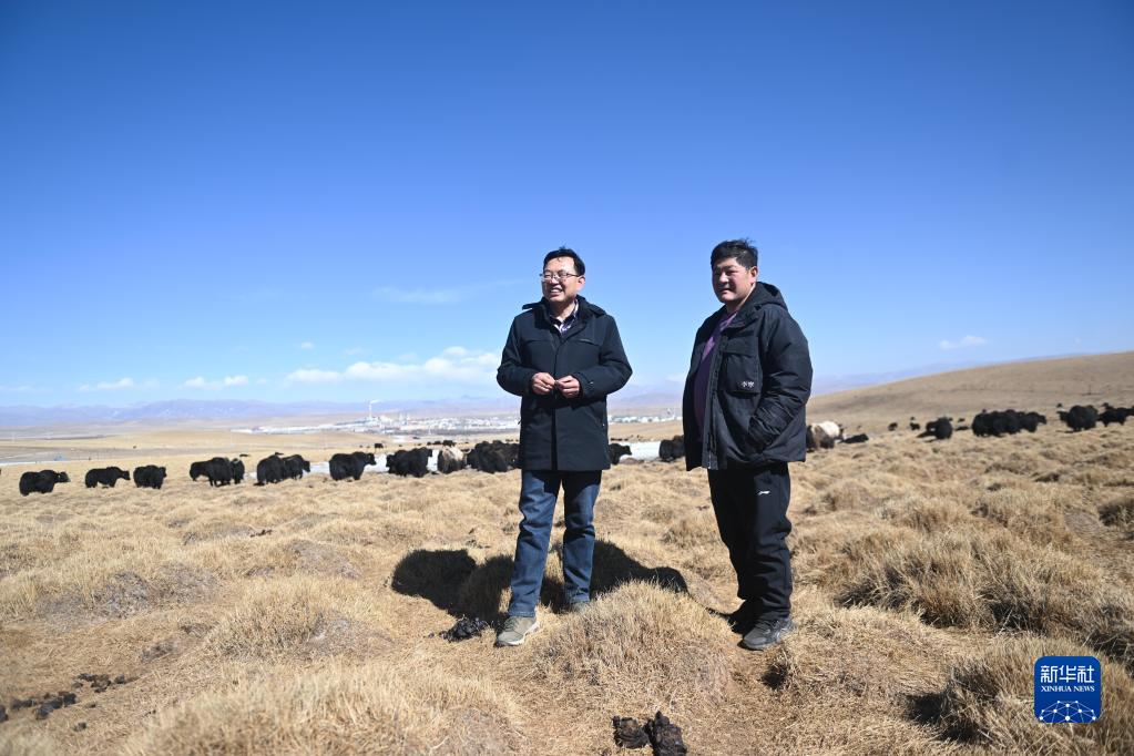 2月24日,在青海省海北藏族自治州海晏縣青海湖鄉達玉日秀村,董全民(左)查看牧民東知布家的草場(chǎng)。