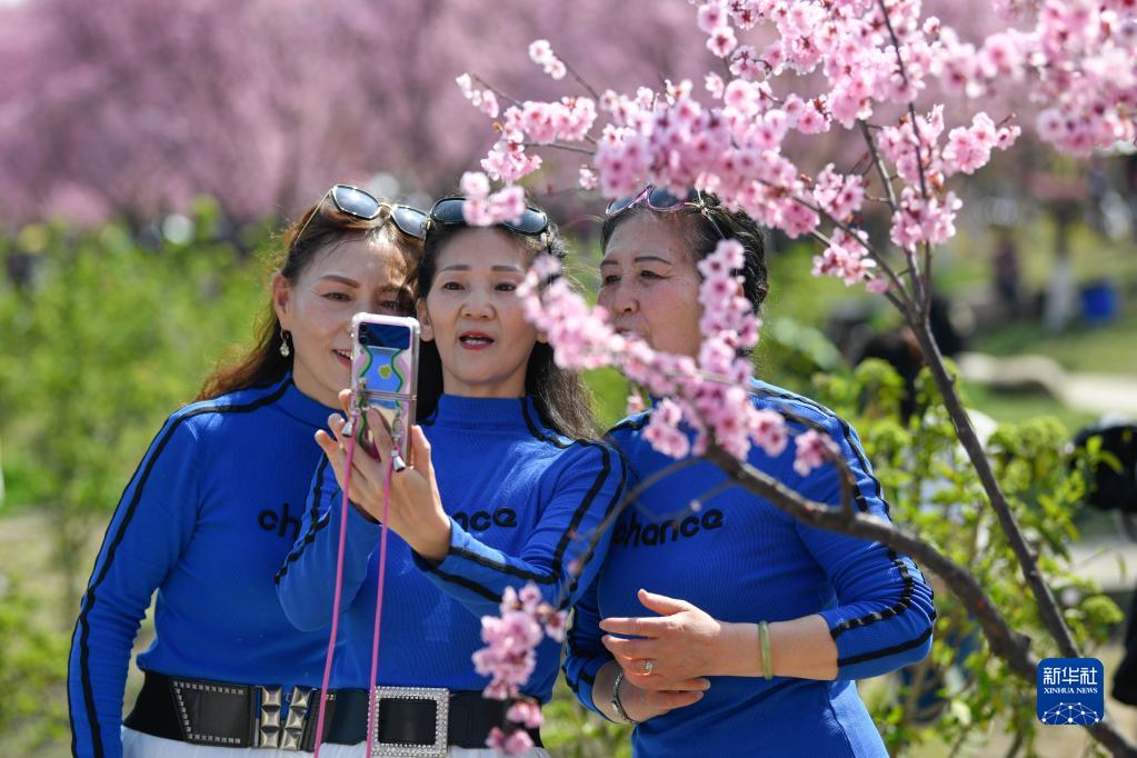 3月8日,游人在都江堰市青城山鎮“問(wèn)花村”自拍。