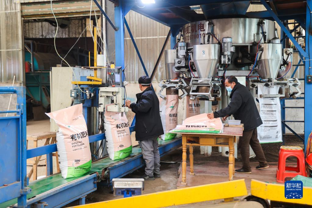 3月7日,在湖南省益陽(yáng)市桃江縣灰山港鎮一肥料車(chē)間,工作人員在打包運往澧縣的有機肥料。