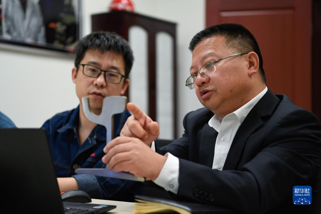 在攀鋼集團研究院,鄒明(右)與同事一起討論道岔設計方案(2月21日攝)。