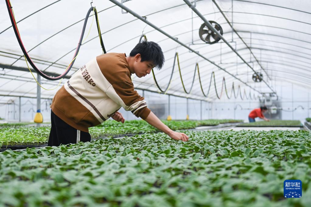 3月8日,工作人員在杭州市臨平區的杭州康成農業(yè)科技有限公司的溫室內查看菜苗長(cháng)勢。