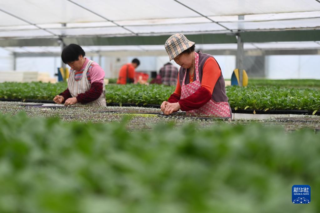 3月8日,工作人員在杭州市臨平區的杭州康成農業(yè)科技有限公司的溫室進(jìn)行移苗工作。