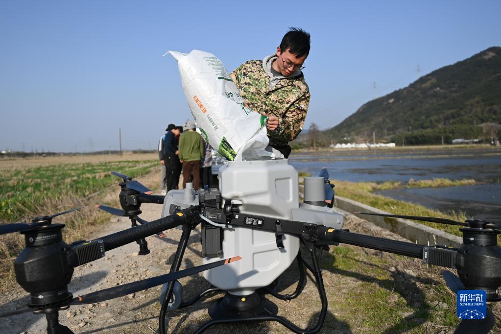 在寧波市奉化區西塢街道四維村,種糧戶(hù)將肥料倒入植保無(wú)人機的裝置中(3月7日攝)。