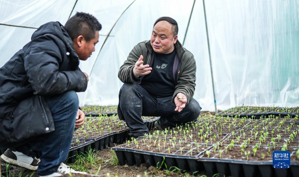 李世瑤(右)在六枝特區銀壺街道東風(fēng)村給種植戶(hù)介紹西瓜育苗技術(shù)要點(diǎn)(2月25日攝)。