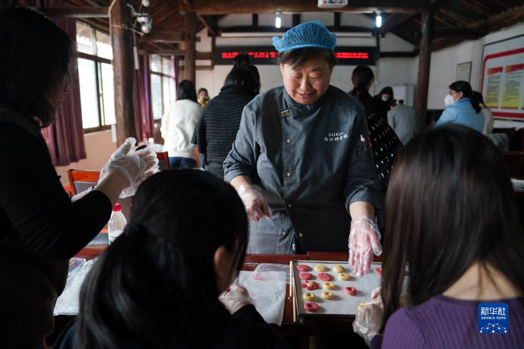 在北京市密云區金叵羅村,“三嫂子”楊紅艷在為來(lái)村參觀(guān)并進(jìn)行小米酥制作體驗的客人示范小米酥制作(2023年3月7日攝)。