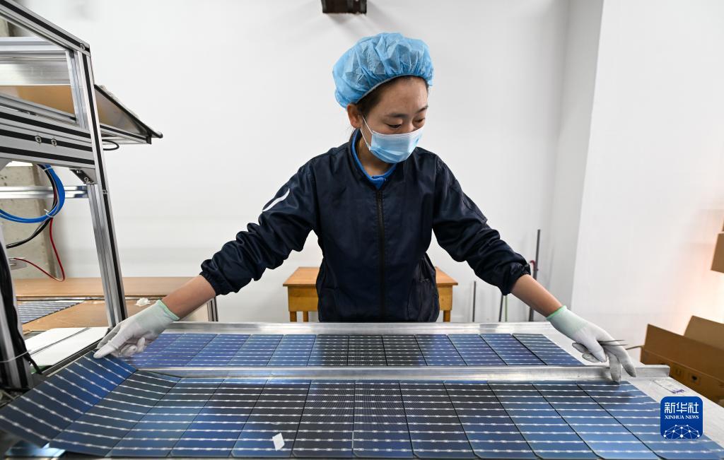 在天津一家新能源公司生產(chǎn)車(chē)間,工作人員在加工光伏組件(3月7日攝)。