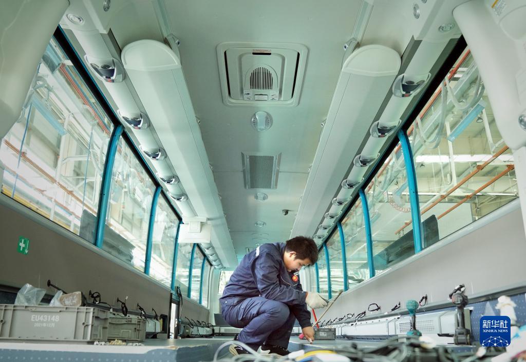 3月8日,工作人員在宇通新能源廠(chǎng)區高端及海外承裝車(chē)間裝配車(chē)輛內飾。
